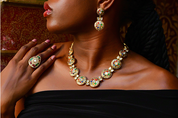 Our most extraordinary statement pieces with rich gems and settings, inspired by royal Indian artistry.